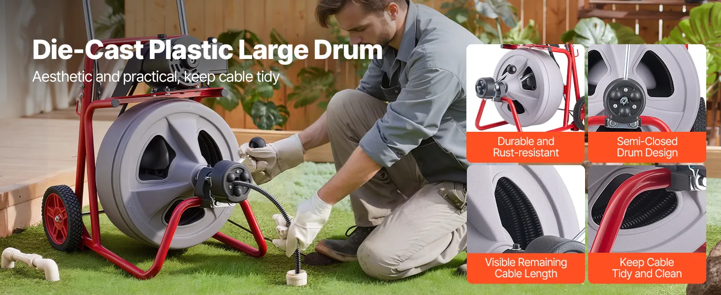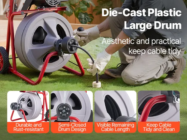Durable & Convenient: Our sewer drain auger features a semi-enclosed plastic drum that is durable and rust-resistant, allows easy observation of the cable length, and helps keep the cable neatly stored