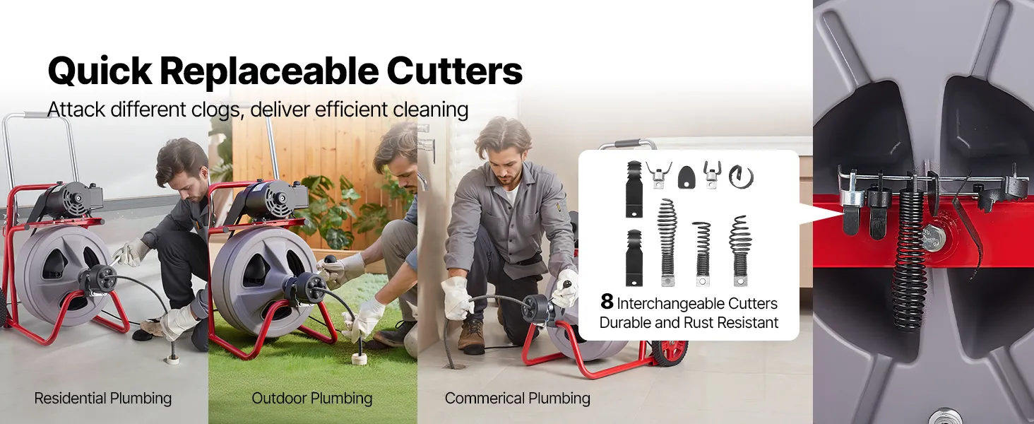 8 Interchangeable Cutters: The electric drain auger features 8 cutters, ideal for clearing blockages in pipes, floor drains, sinks, and toilets. Simplify trouble maintenance and eliminate bad smell — suitable for homes, properties, and restaurants