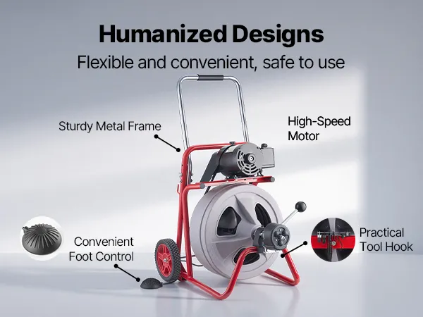 VEVOR sewer drain auger combines convenience with durability, featuring large wheels for effortless movement, and a telescopic handle for more ergonomic use.