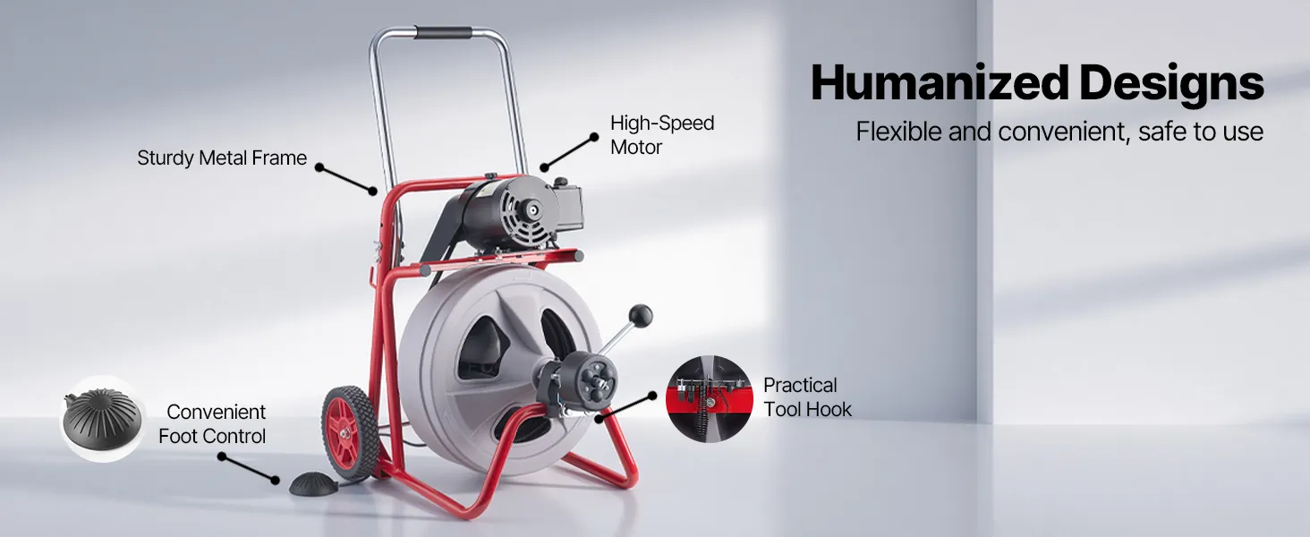 Efficient Clog Clearing: The VEVOR drain cleaner machine features an automatic feeding system to power the cable in and out of drainage pipes. Enhanced with forward/reverse control and an air-activated foot switch, managing the cable becomes more effortless