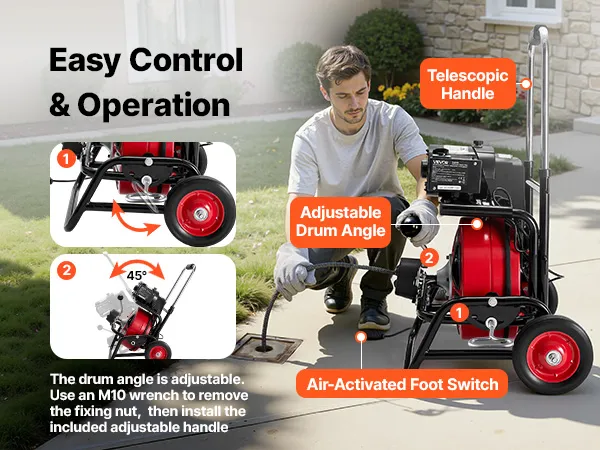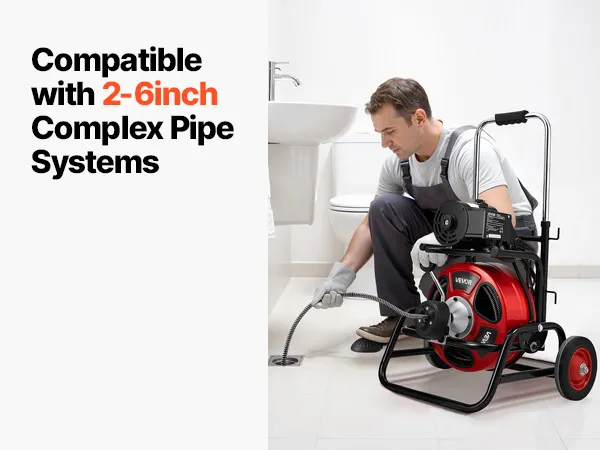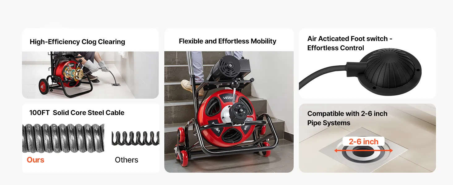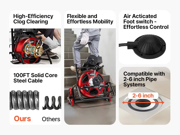 Easy Operation & Versatile Cutters: Enhanced with CW/CCW control and an air-activated foot switch, cable management is effortless. Paired with the 8 interchangeable cutters, the sewer auger handles various clogs in drain pipes, sinks, sewers, toilets, etc