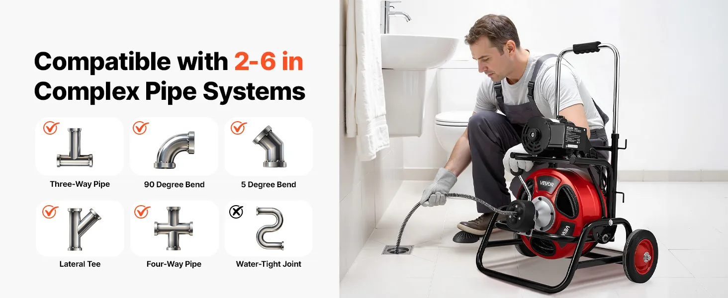 Are you tired of clogged drainage pipes, expensive plumbing services, and incomplete unclogging? Say bye to bad smells and troublesome maintenance. Let VEVOR electric drain cleaning machine with a 30m x 12.7mm solid core steel cable deliver fast, efficient pipe blockage clearing.