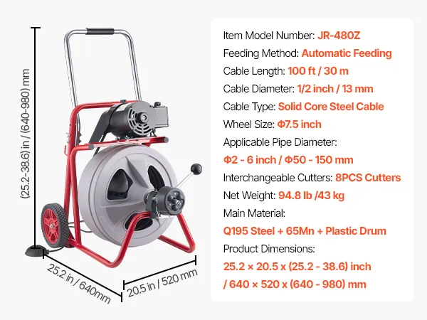 VEVOR sewer drain auger combines convenience with durability, featuring large wheels for effortless movement, and a telescopic handle for more ergonomic use.