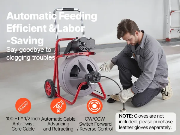 Efficient Clog Clearing: The VEVOR drain cleaner machine features an automatic feeding system to power the cable in and out of drainage pipes. Enhanced with forward/reverse control and an air-activated foot switch, managing the cable becomes more effortless