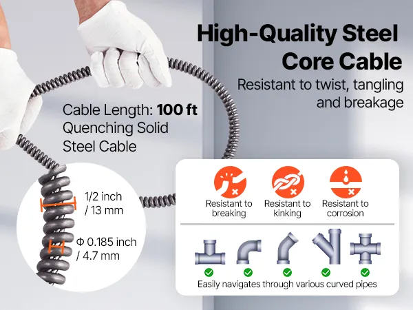 Premium Steel Core Cable: Our 30m x 13mm solid core steel cable resists breakage, twisting, kinking, and corrosion, smoothly navigating 50mm to 150mm complex curved pipes for more reliable and efficient clog-clearing results