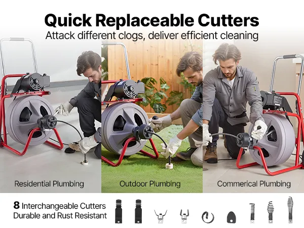 8 Interchangeable Cutters: The electric drain auger features 8 cutters, ideal for clearing blockages in pipes, floor drains, sinks, and toilets. Simplify trouble maintenance and eliminate bad smell — suitable for homes, properties, and restaurants