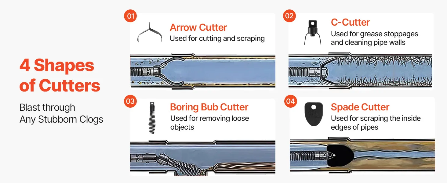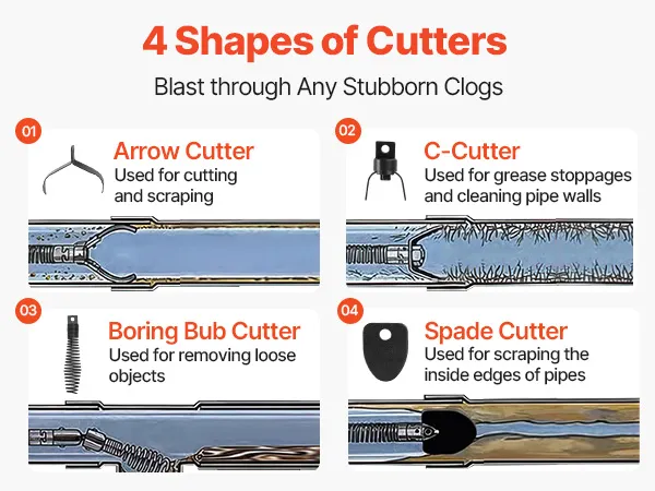 Interchangeable Cutters: Equipped with 4 cutter heads to target different types of blockages. Our electric sewer auger is ideal for clearing clogs in sewer pipes, sinks and toilets, helping simplify troublesome maintenance and eliminate unpleasant odors