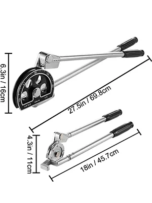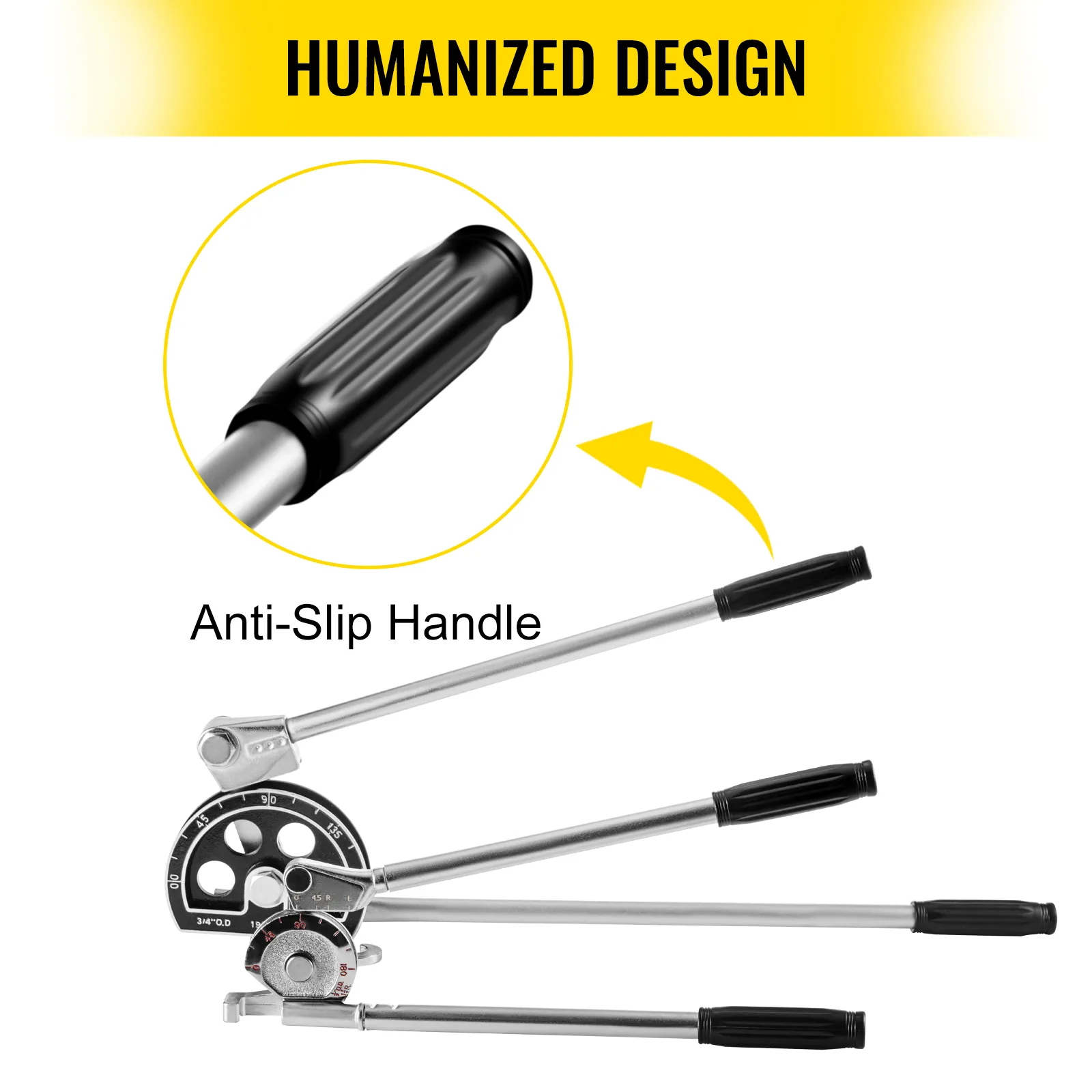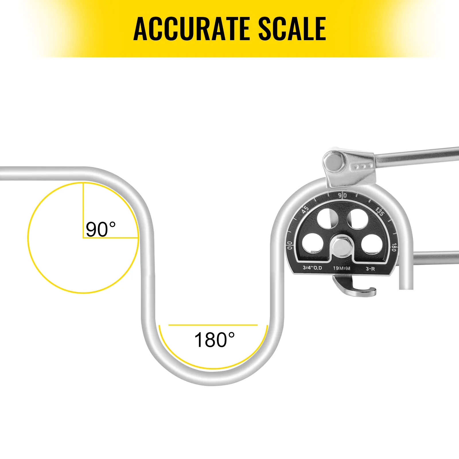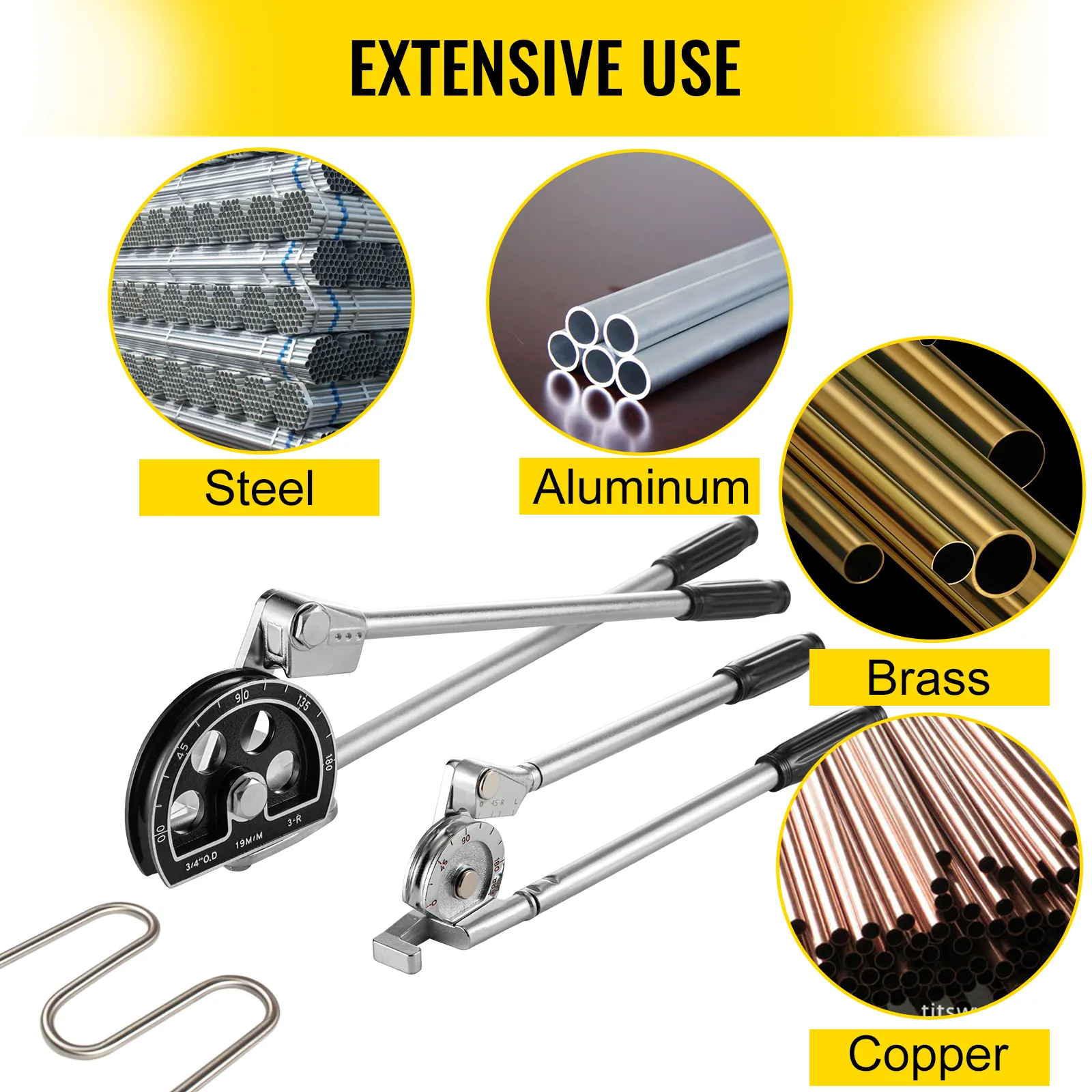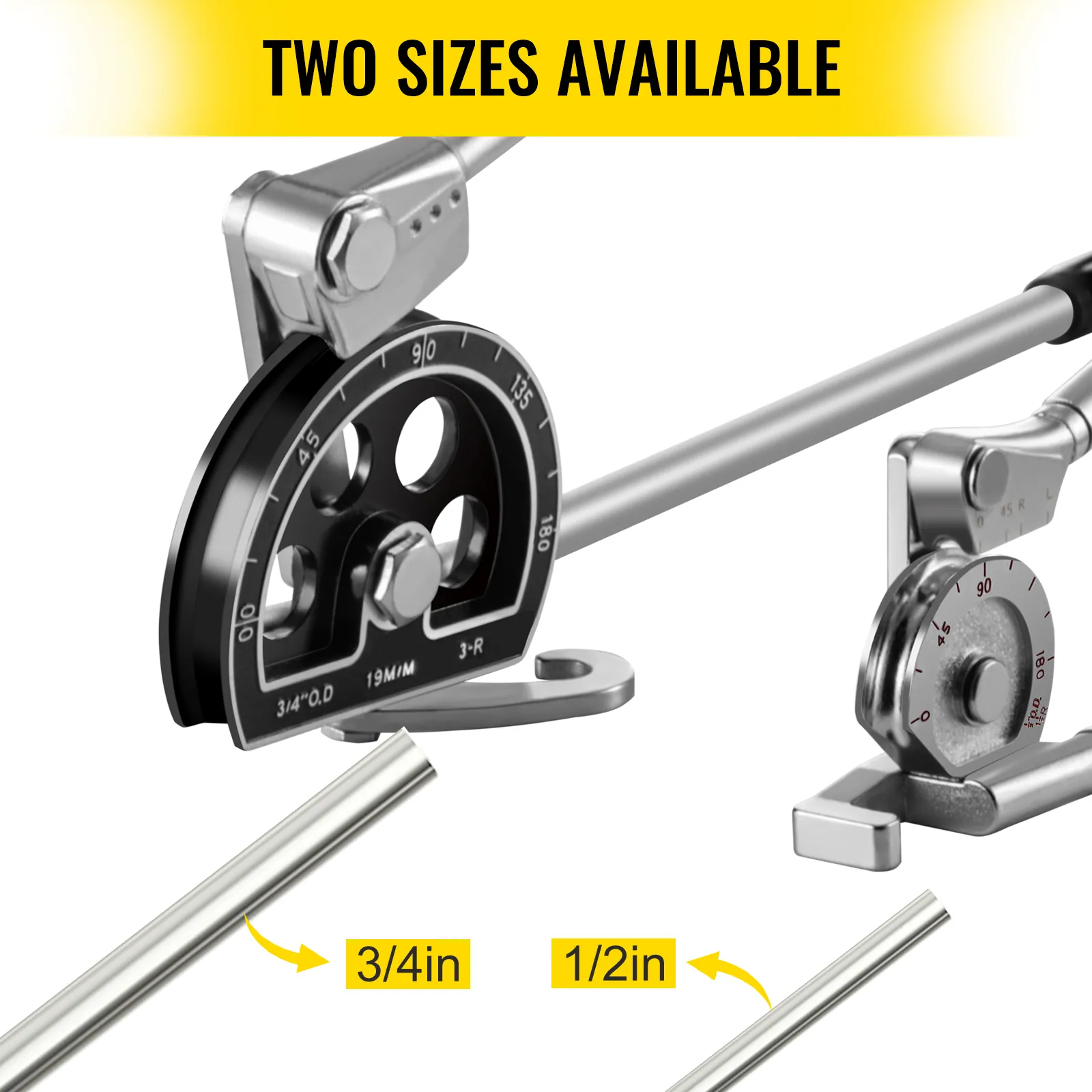 This high-quality manual pipe bender, made of aluminum and steel, is durable and corrosion-resistant. The pipe bender is available in two sizes for 3/4 inch and 1/2 inch pipes.