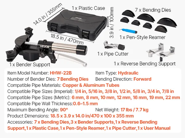 Powered by a hydraulic system, this tube pipe bender tool easily bends copper and aluminum pipes from 1/4 in to 7/8 in (6 to 22 mm). With a 0° to 90° bending angle, 7 aluminum alloy dies, and a dual-direction bending design, it is built for HVAC installation, auto repair, and industrial maintenance.