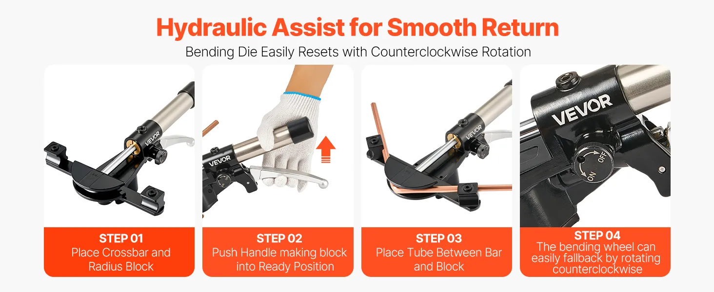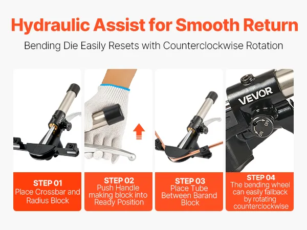 After bending, simply rotate counterclockwise to reset instantly. This HVAC pipe bender tool set features a hydraulic assist for smooth return and easy operation.