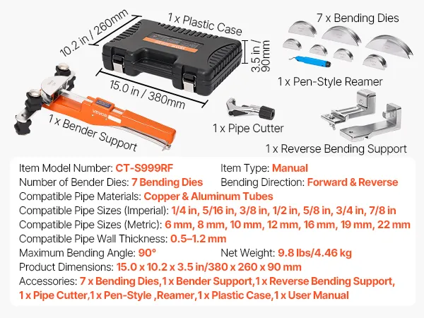 This manual ratcheting tube pipe bender tool comes with 7 dies, supporting precise bending of copper and aluminum tubes from 1/4 inch to 7/8 inch (6 to 22 mm). With a 0° to 90° bending angle, it is ideal for HVAC installation, auto repair, and DIY use. Compact build makes it easy to carry and store.