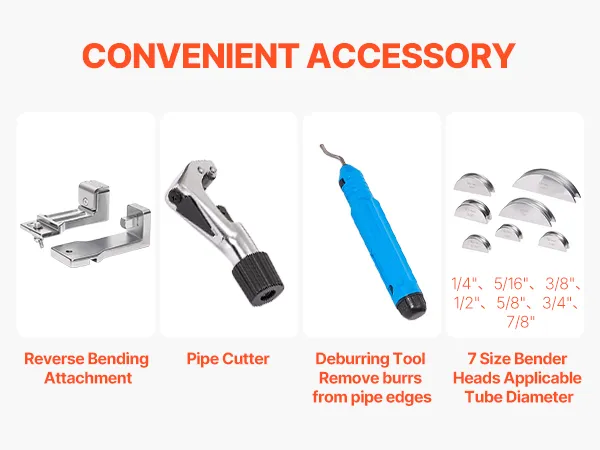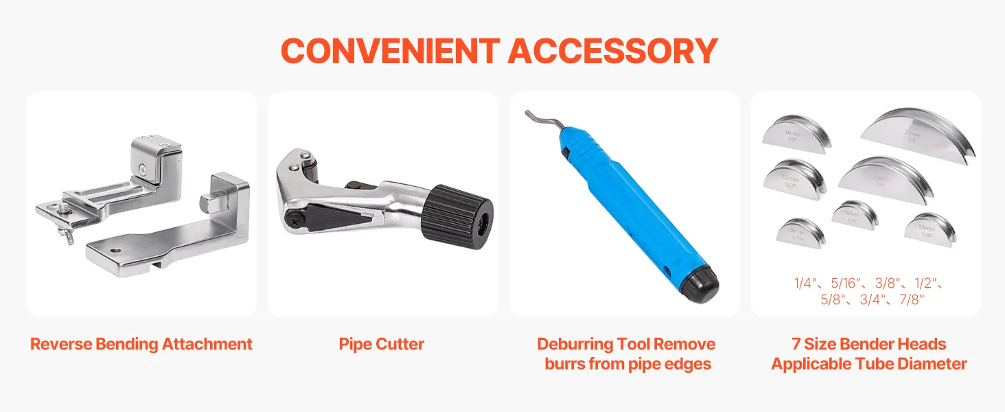7 Bending Dies Included: Comes with 7 bending dies from 1/4 inch to 7/8 inch (6 to 22 mm). Our ratcheting tubing bender allows you to handle multiple tubing sizes