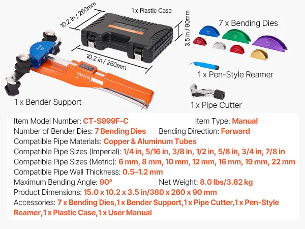 This manual ratcheting tube pipe bender tool comes with 7 dies, supporting precise bending of copper and aluminum tubes from 1/4 inch to 7/8 inch (6 to 22 mm). With a 0° to 90° bending angle, it is ideal for HVAC installation, auto repair, and DIY use. Compact build makes it easy to carry and store.