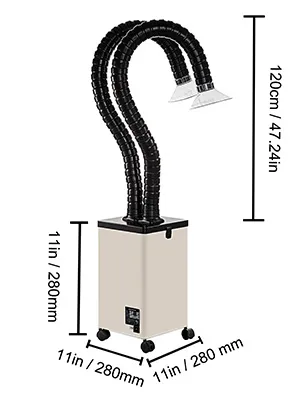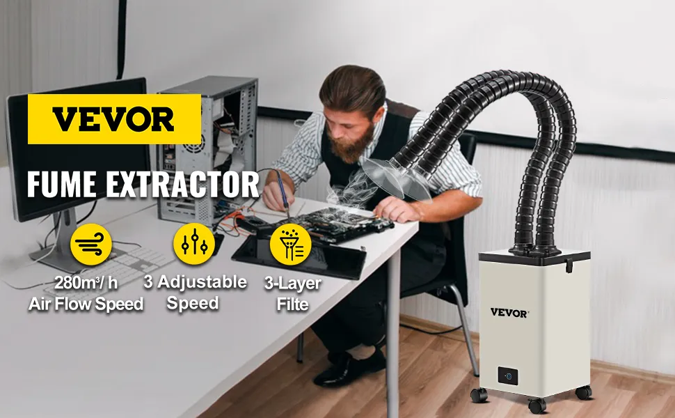 Our soldering fume extractor strongly absorbs the harmful smoke and dust produced by soldering, laser printing, welding, 3D printing, manicure, and so on. Through 3-stage filters, the air purification rate can be achieved to 99.91%. The smaller size is suitable for narrow spaces. Eyes on VEVOR FL250 fume extractor and air purifier, keep your workspace clean and fresh.