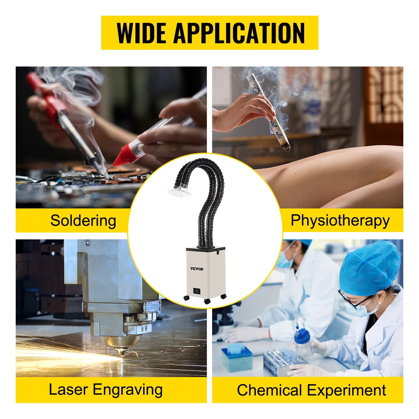 Suitable for bench top soldering and electronic rework applications as well as laser, handheld machining operations. Widely used in physiotherapy, laser engraving, chemical experiment, home and office.