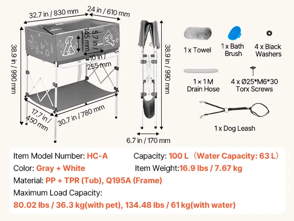 VEVOR Dog Bathtub, Elevated Dog Bath Tub, Collapsible Pet Bathing Grooming Wash Station, Portable Foldable Space-saving, with Built-In Drain Hose for Small and Medium Pet Cat Indoor & Outdoor, Gray