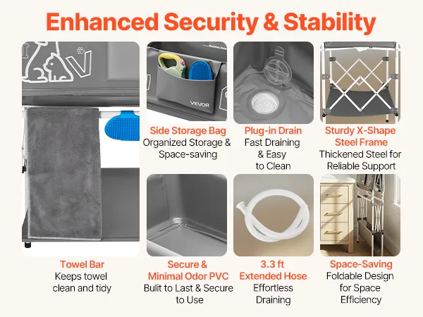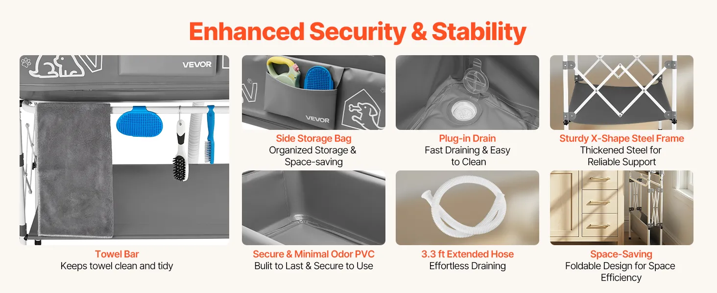 Stable & Secure Support: This dog bath tub features a reinforced X-frame steel stand, adjustable security strap, and thick support tubes with non-slip pads. Together, they help reduce slipping, shaking, and sudden movement during bath time