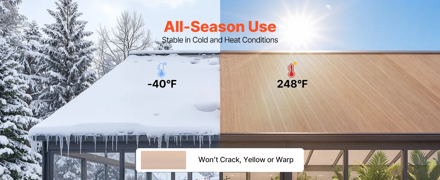 VEVOR roof panels withstand hail, debris, and strong winds for long-lasting outdoor coverage.