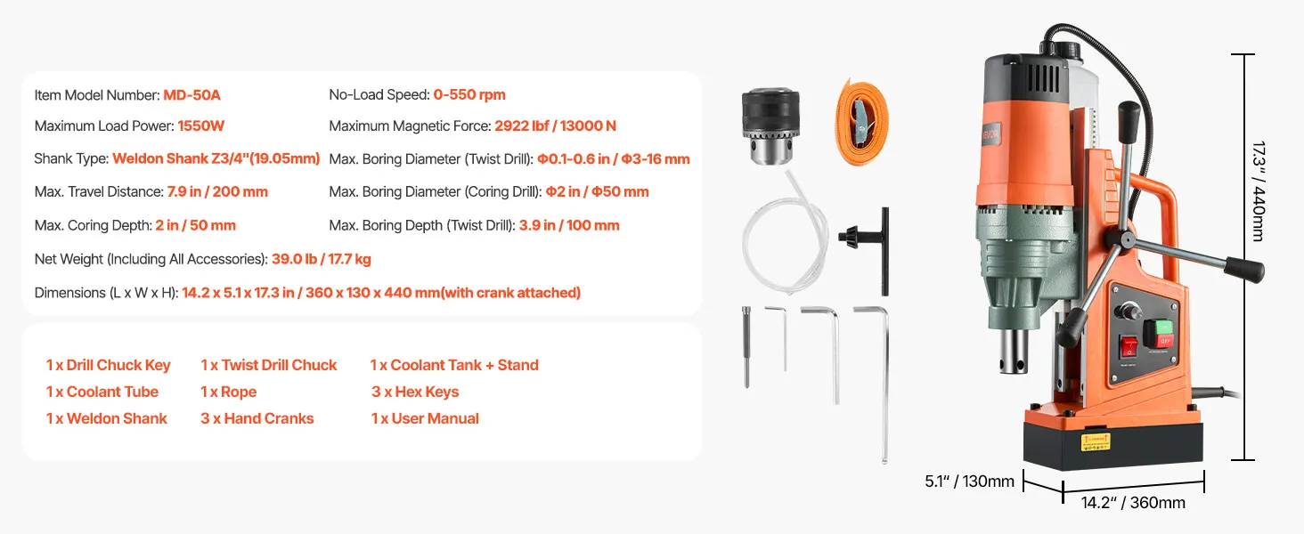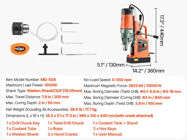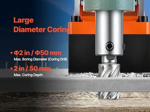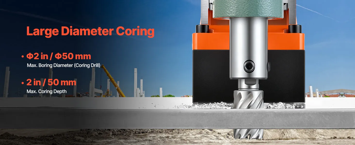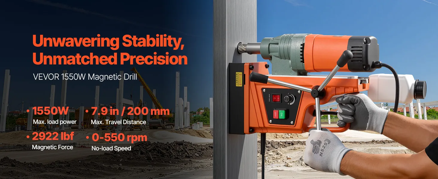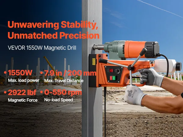 High-Strength Magnetic Base: Equipped with a 1550W copper motor, this magnetic drill press delivers powerful and stable performance. It easily drills through tough materials at 0-550 RPM. Max Coring Diameter: 2"/50 mm; Max Coring Depth: 2"/50 mm