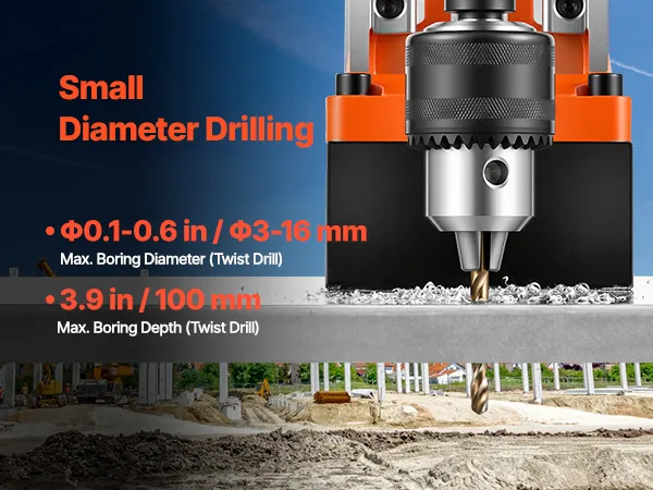 A: Max boring diameter of the coring drill is 2"/50 mm; Boring diameter of the twist drill is 0.1"-0.6"/3-16 mm.