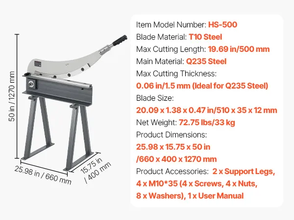 This sheet metal shear is ideal for cutting aluminum, stainless steel, and low-carbon steel. It features T10 steel blades and a round blade, with a max cutting length of 19.69 in, thickness of 0.06 in, and a round steel capacity of 0.06 in. A <0.07 mm gap ensures precise, burr-free cuts.