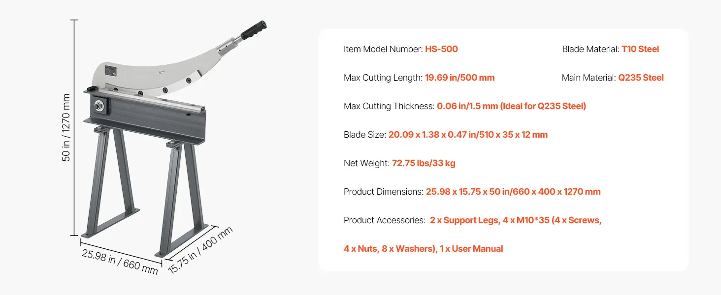 High-Efficiency Cutting: This shear can easily handle larger materials, with a max cutting length of 19.69 in/500 mm, thickness of 0.06 in/1.5 mm, and round steel diameter of 0.06 in/1.5 mm, improving work efficiency and meeting daily cutting needs