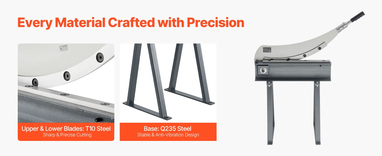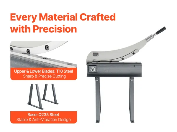 Our cutter is made with T10 steel upper and lower blades and a T10 steel round blade, all heat-treated to HRC52–54 for sharpness. It's built to be tough and edge rolling-resistant. The Q235 steel frame and base provides stable support, reducing vibration and ensuring clean, precise cuts every time.