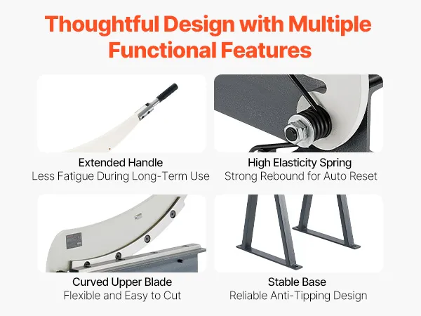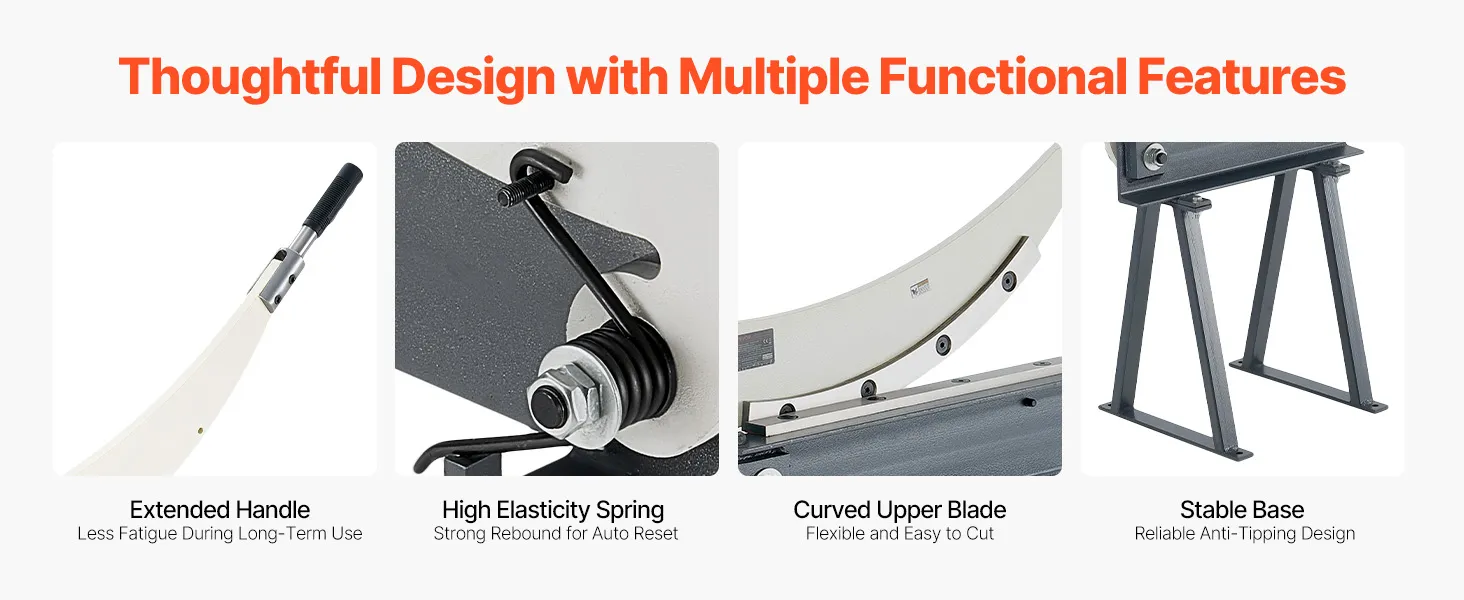 Our metal shear machine features an extended handle designed with leverage in mind for less fatigue. It includes a high-elasticity spring for automatic reset, a curved upper blade for flexible cutting, and a stable base to ensure secure operation.