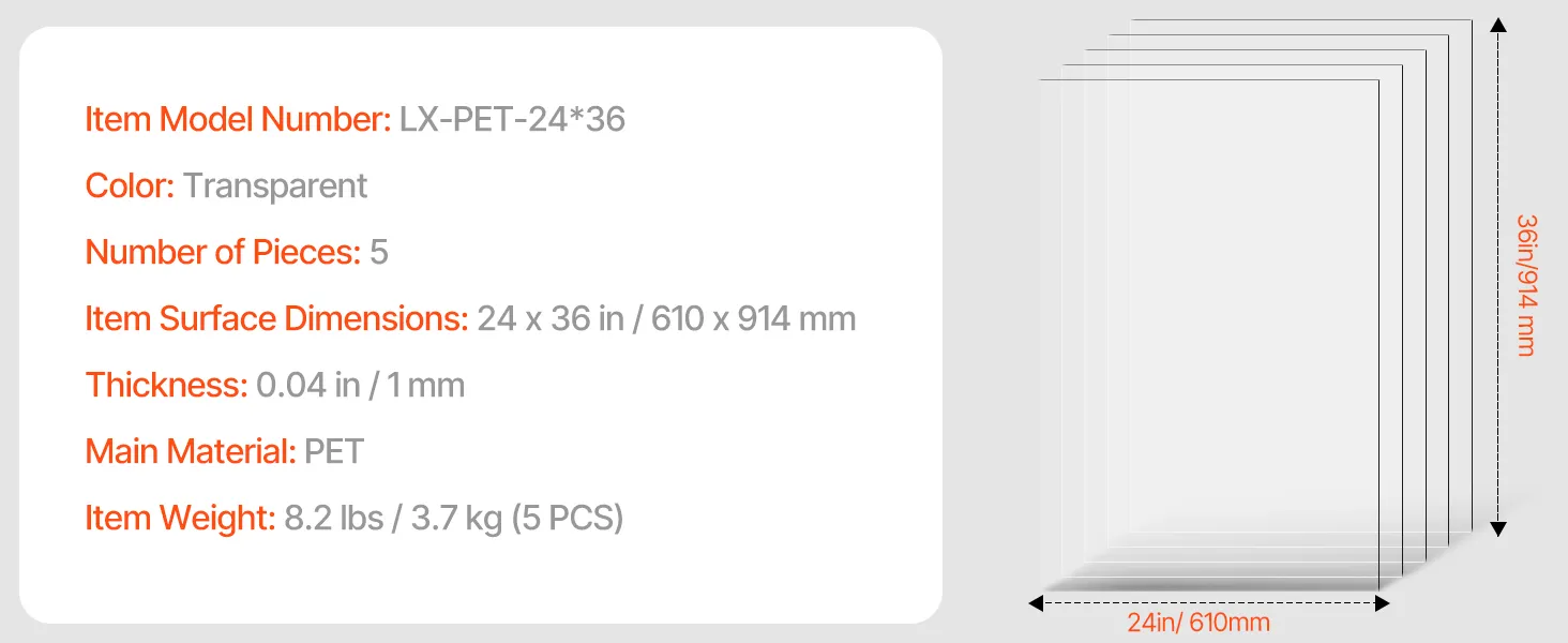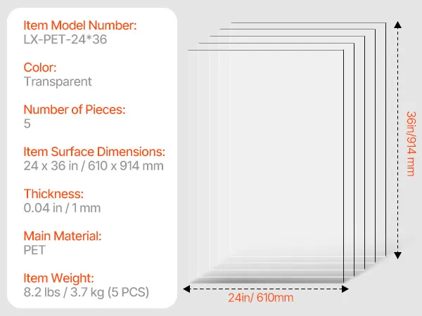 5-Piece PET Sheets: Our PET sheet set measures 24 x 36 inches with a thickness of 0.04 inches (1 mm), making them a better choice for your DIY craft projects. Additionally, we offer a variety of sizes and thicknesses to meet your diverse needs