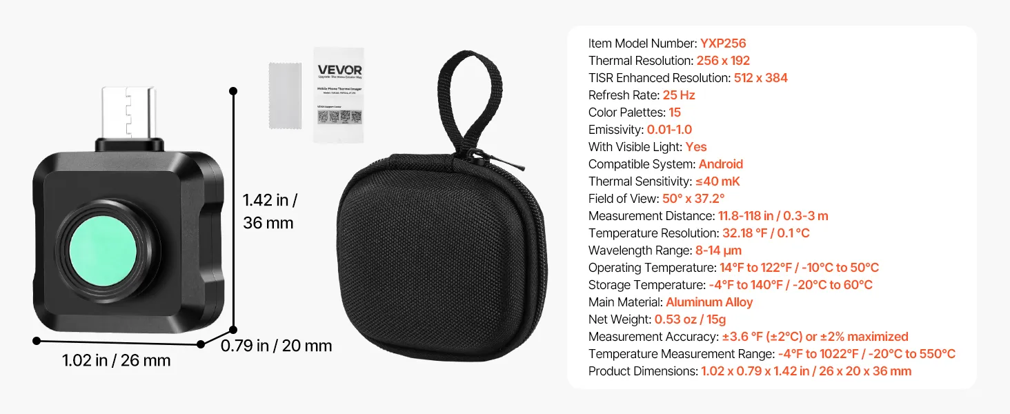 VEVOR Thermal Imaging Camera for Android, 512 x 384 TISR Super Resolution, 25HZ Refresh Rate Infrared Thermal Imager for Smartphone Tablet, 256 x 192 IR Resolution, -20°C to 550°C & 15 Color Palettes