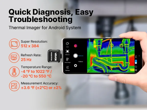 With 512 x 384 super resolution, 256 x 192 IR resolution, 25HZ refresh rate and -20°C to 550°C temperature measurement range, VEVOR thermal imaging camera for Android is is an ideal choice for home inspection, HVAC, electrical diagnostics, and more.
