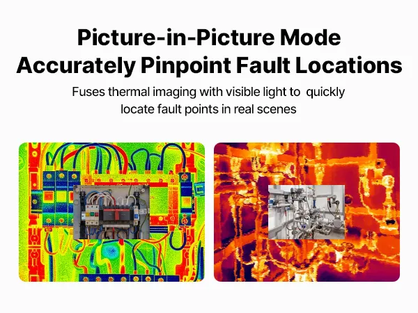 Capture a visible-light image with your phone and overlay it with thermal imaging in PIP mode to quickly and accurately pinpoint fault locations.