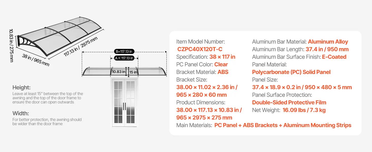 VEVOR Awnings for Door Entrance, 38 x 117 in, Exterior Front Door Window Awnings with Drainage & ABS Bracket, Rain Snow Sun Protection, Overhang Polycarbonate Door Canopy for Porch Patio, Clear