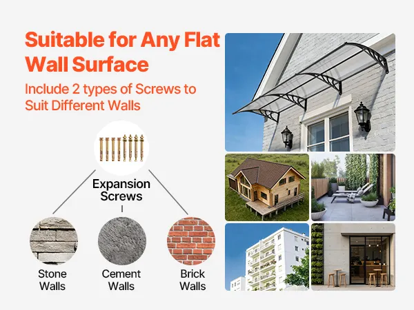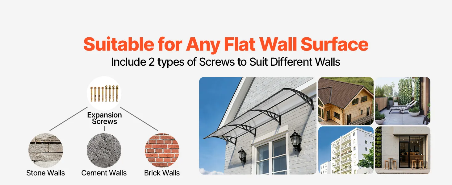 Quick DIY Installation: This exterior door canopy comes with a complete accessory kit, clear installation instructions, and two types of mounting screws for brick, concrete, or wooden walls. Easy for one-person DIY installation. Measure your space for an ideal fit