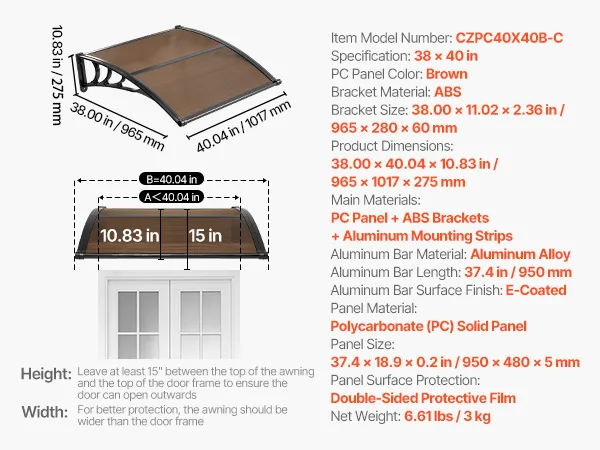 VEVOR Awnings for Door Entrance, 38 x 40 in, Exterior Front Door Window Awnings with Drainage & ABS Bracket, Rain Snow Sun Protection, Overhang Polycarbonate Door Canopy for Porch Patio, Brown