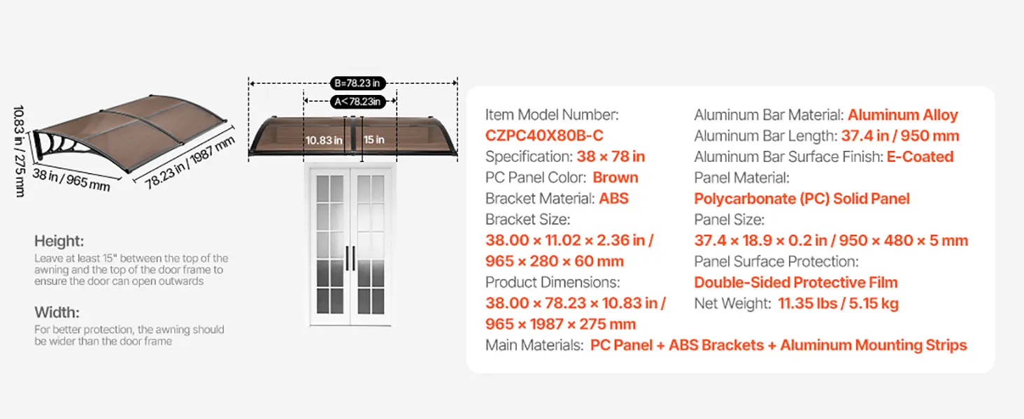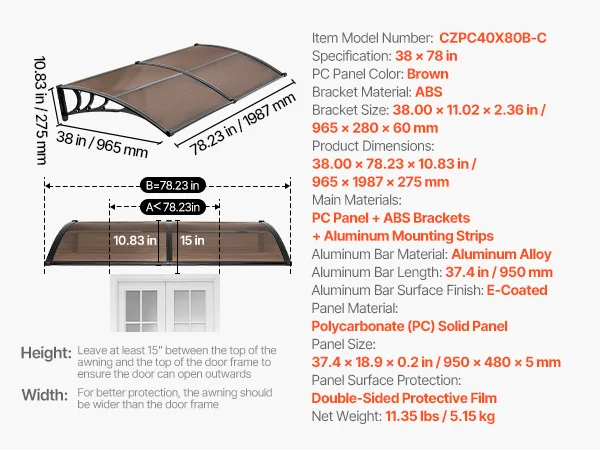 VEVOR Awnings for Door Entrance, 38 x 78 in, Exterior Front Door Window Awnings with Drainage & Metal Bracket, Rain Snow Sun Protection, Overhang Polycarbonate Door Canopy for Porch Patio, Brown