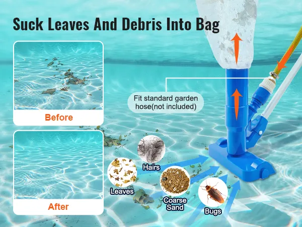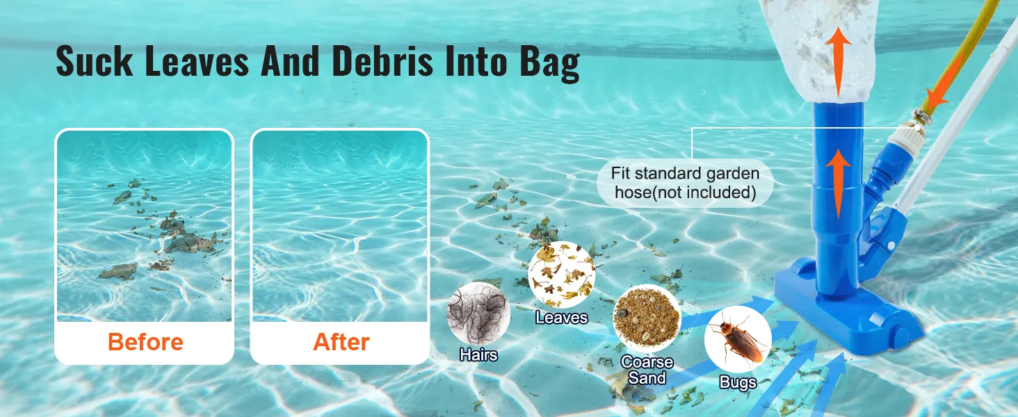 This pool vacuum cleaner is an efficient tool for your pool. Equipped with a regular hose inlet that allows you to easily connect it to a garden hose(not included), the water pressure from your garden hose creates a venturi effect that will draw leaves and other debris into the collection bag.