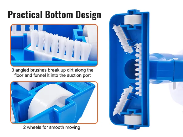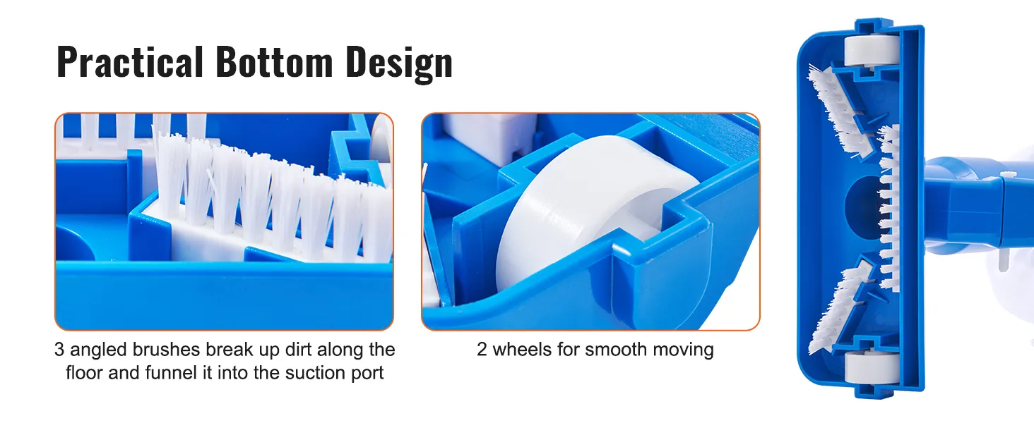 • 3 Cleaning Brushes: Three brushes are attached to the end of the pole for more thorough cleaning. The brushes help to loosen stubborn dirt and debris, making it easier for the vacuum to suction it up. And the handheld pool vacuum is equipped with two wheels on the bottom, ensuring smooth movement underwater.