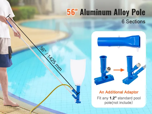 • 56’’ Aluminium Alloy Pole: With its 6-section poles measuring 56" in length, the inflatable pool cleaner provides an extended reach to effectively clean every corner of your pool. The poles can be assembled in different ways to match your specific distance needs. Plus, it includes an extra adaptor to fit any standard 1.2" pool pole, so you're all set.