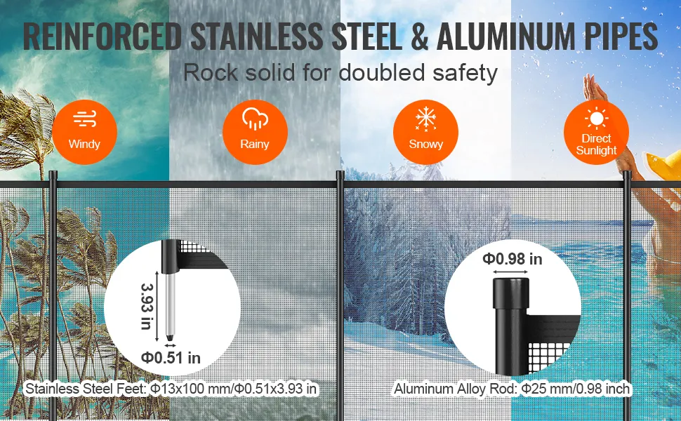 Durable Frame Material: Crafted with premium stainless steel legs and aluminum pipes, our pool safety fence boasts a robust and long-lasting frame, resistant to corrosion and wear. Even on windy and rainy days, it ensures your pool's safety.