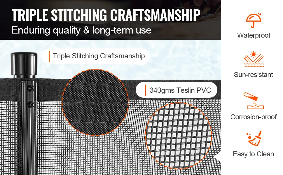 The combination of 340gms Teslin PVC mesh fabric and triple stitching ensures high waterproof, oil-resistant, and acid-alkali-resistant properties, keeping your pool fences for inground pools looking new for years.