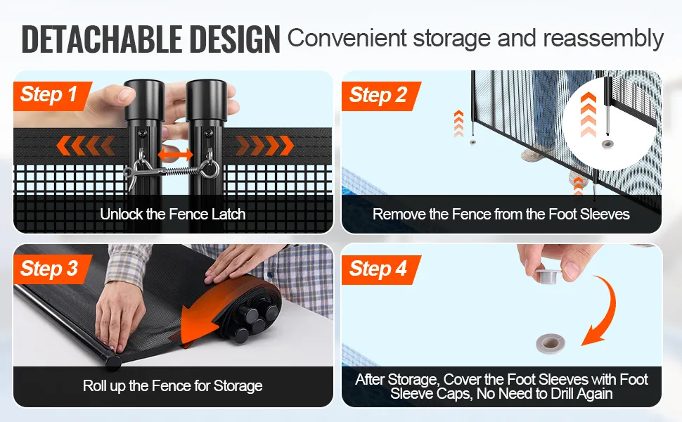 One-Step Quick Installation: Featuring pre-installed hooks and compatibility with cement and concrete pavement, the pool fences for inground pools offer a hassle-free installation, requiring no professional skills. Moreover, its convenient disassembly ensures easy storage.