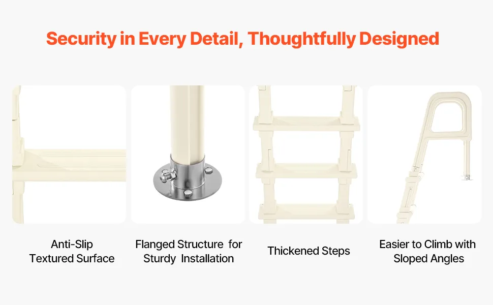 Our pool ladder comes with flanged mounting accessories. The progressively thickened steps provide secure entry and exit, helping to avoid slips and falls.