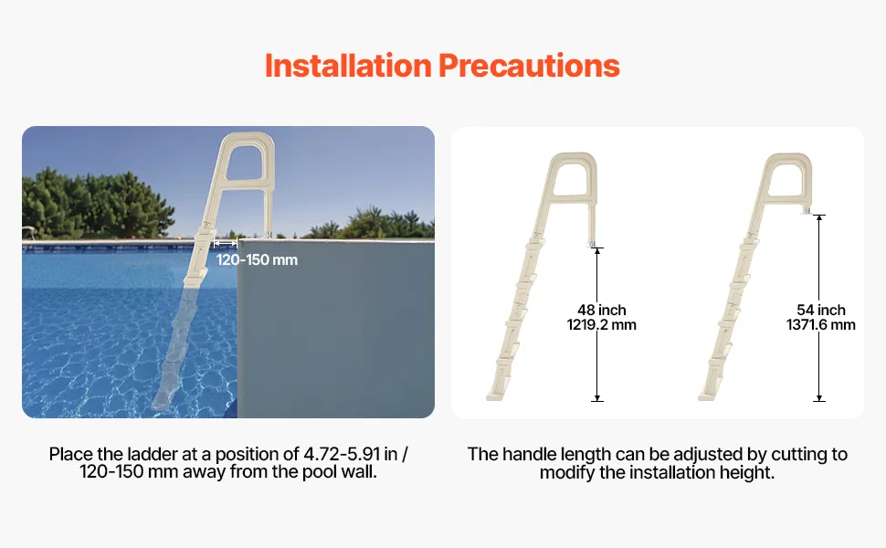 User-friendly 75° Inclined Angle: The pool ladder’s 75° inclined design allows smoother and easier entry and exit from the pool. With extra-wide 4.72-inch steps, both adults and children can use the ladder comfortably and securely. Please also ensure that the bottom of the first step is installed close to the pool floor