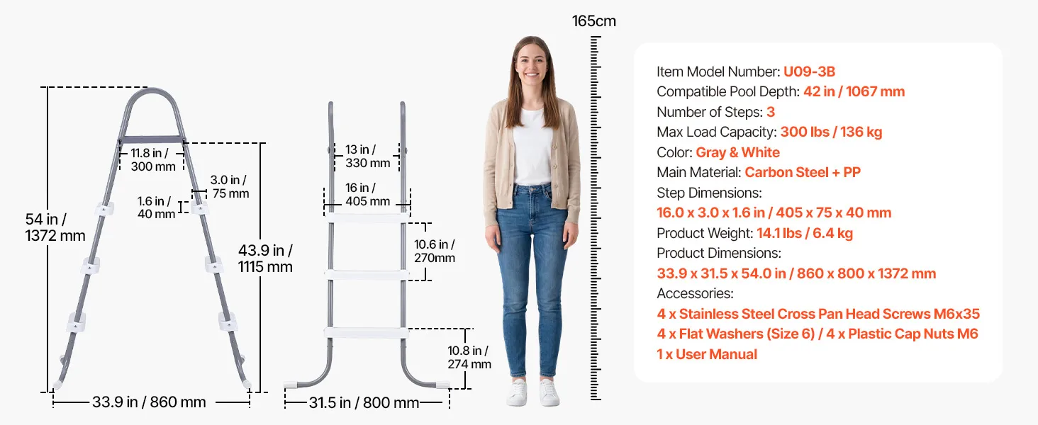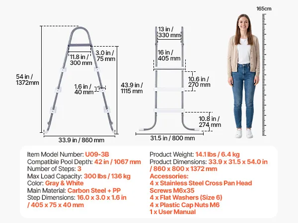 Easy Setup: These pool ladders assemble quickly in just a few simple steps. All required parts and screws are included for fast, straightforward, and hassle-free installation