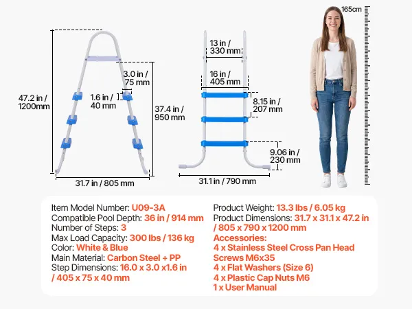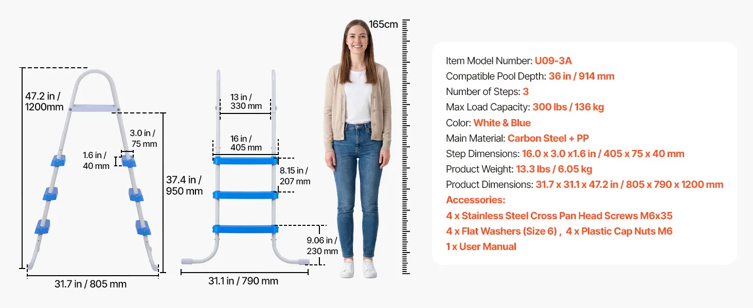 Easy Setup: These pool ladders assemble quickly in just a few simple steps. All required parts and screws are included for fast, straightforward, and hassle-free installation