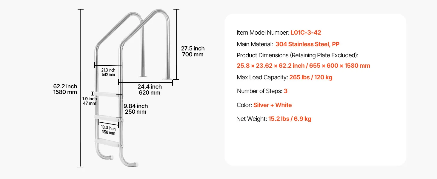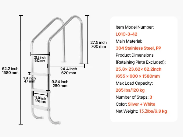 265 lbs Load Support: Supporting up to 265 lbs, this swimming pool ladder is suitable for adults and younger swimmers alike. Thickened steps with textured surfaces provide steady and secure footing