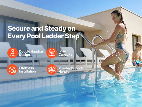 Dual-Handrail 3-Step Pool Ladder: Built with side handrails and three non-slip steps, this pool ladder is suitable for 48–54 inch above-ground and in-ground pools. Rubberized step surfaces maintain grip underwater, allowing smooth and secure pool access