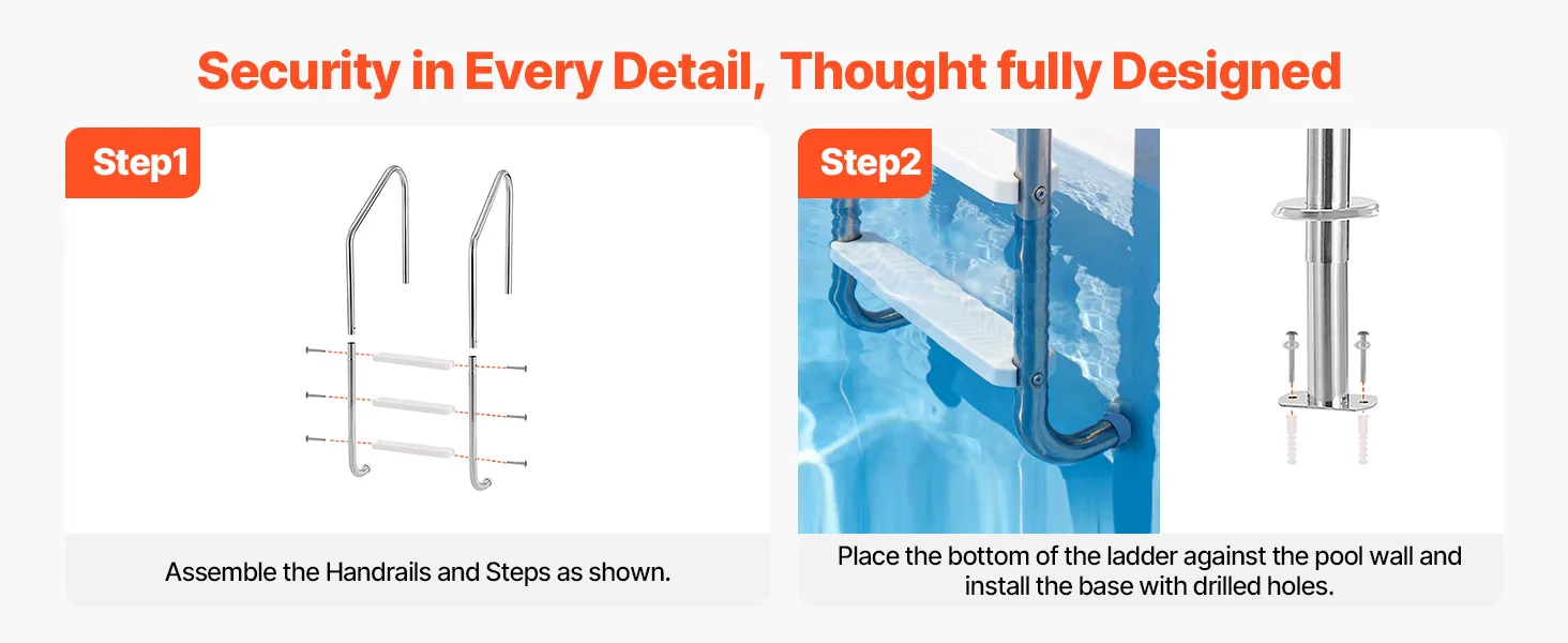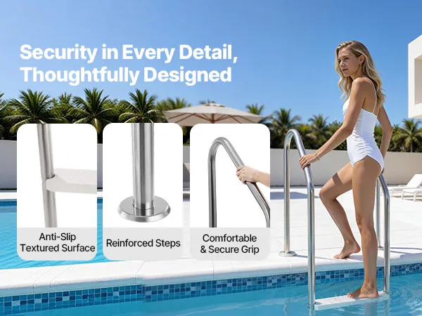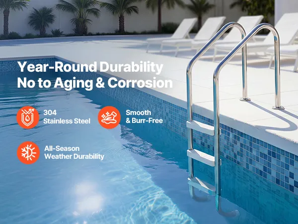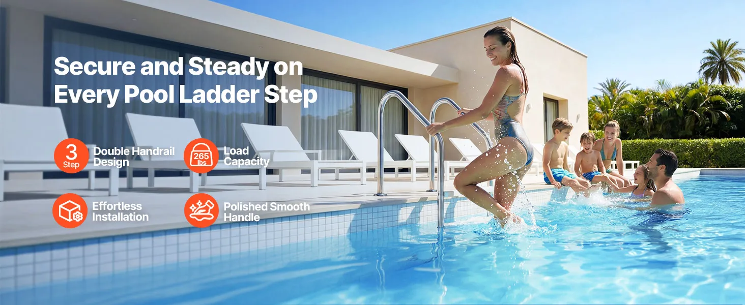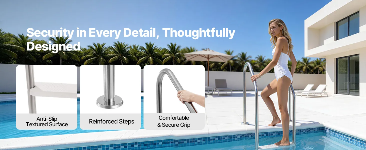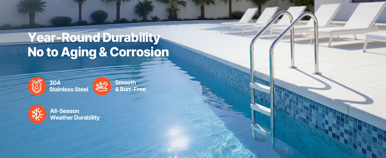 Premium Stainless Steel Frame: Built from strong 304 stainless steel, this pool ladder withstands water impact and daily wear. The anodized surface helps handle sun exposure while precise welding ensures lasting stability for indoor and outdoor pools
