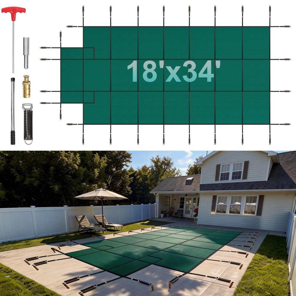 We have a pool safety cover that offers excellent value for money. It provides the same quality as more expensive covers at a fraction of the cost. This green mesh pool cover is an affordable solution to keep your pool protected during the off-season without compromising on quality or durability. With a price point that is hard to beat, our cover stands out as a shrewd investment for any pool owner.